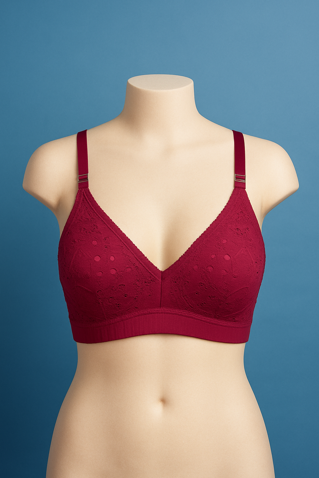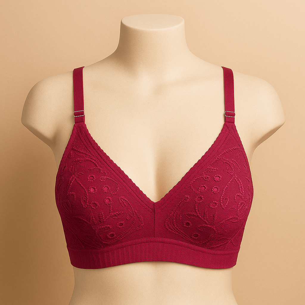The delicate floral lace overlay adds a feminine charm, while the non-wired, stretchable fit gives you complete freedom of movement without compromising support. Perfect for both daily wear and special occasions, this bra combines lightweight comfort with a touch of refined style.